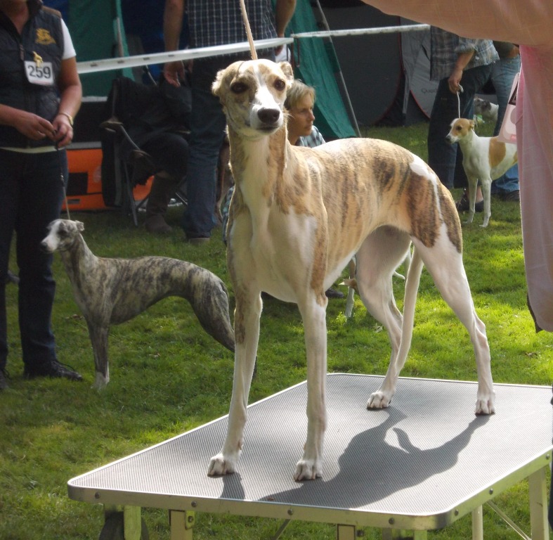 Auch auf dieser Ausstellung bekam Duffy die höchste Formwertnote V. Über diese Bewertung freuen wir uns auch ohne Plazierung, da Frau Gilmour aus dem Ursprungsland der Whippets kommt und dort selbst als Züchterin und Whippetbuch-Autorin über viele Jahre "Whippetgeschichte" geschrieben hat.